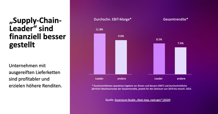 „Führende Unternehmen investieren in hohem Maße in fortschrittliche Technologien, insbesondere in KI und generative KI, um damit die Lieferketten der nächsten Generation aufzubauen“, sagt Matthias Hégelé, Supply Chain & Operations Lead DACH bei Accenture. „Diese Kompetenzen sind für die Neugestaltung von Lieferketten im Hinblick auf Effizienz, Flexibilität, Nachhaltigkeit und Widerstandsfähigkeit unerlässlich. Sie ermöglichen es den Marktführern, heutige und zukünftige Schwachstellen und Ineffizienzen in grundlegenden Lieferkettenfaktoren wie Kosten, Qualität und Lieferung zu überwinden.“