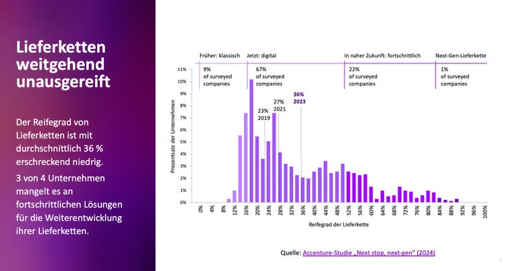Accenture hat für den Bericht „Next stop, next-gen“ 1.148 Unternehmen aus 10 Branchen in 15 Ländern befragt. Die Studie definiert den Reifegrad einer Lieferkette daran, wie umfangreich Unternehmen generative KI, maschinelles Lernen und andere Technologien für autonome Entscheidungsfindung, anspruchsvolle Simulationen und kontinuierliche Verbesserungen in ihren Lieferketten einsetzen. Diese Kompetenzen ermöglichen Unternehmen, sich schneller an Veränderungen anzupassen und neue Technologien nahtlos zu integrieren.